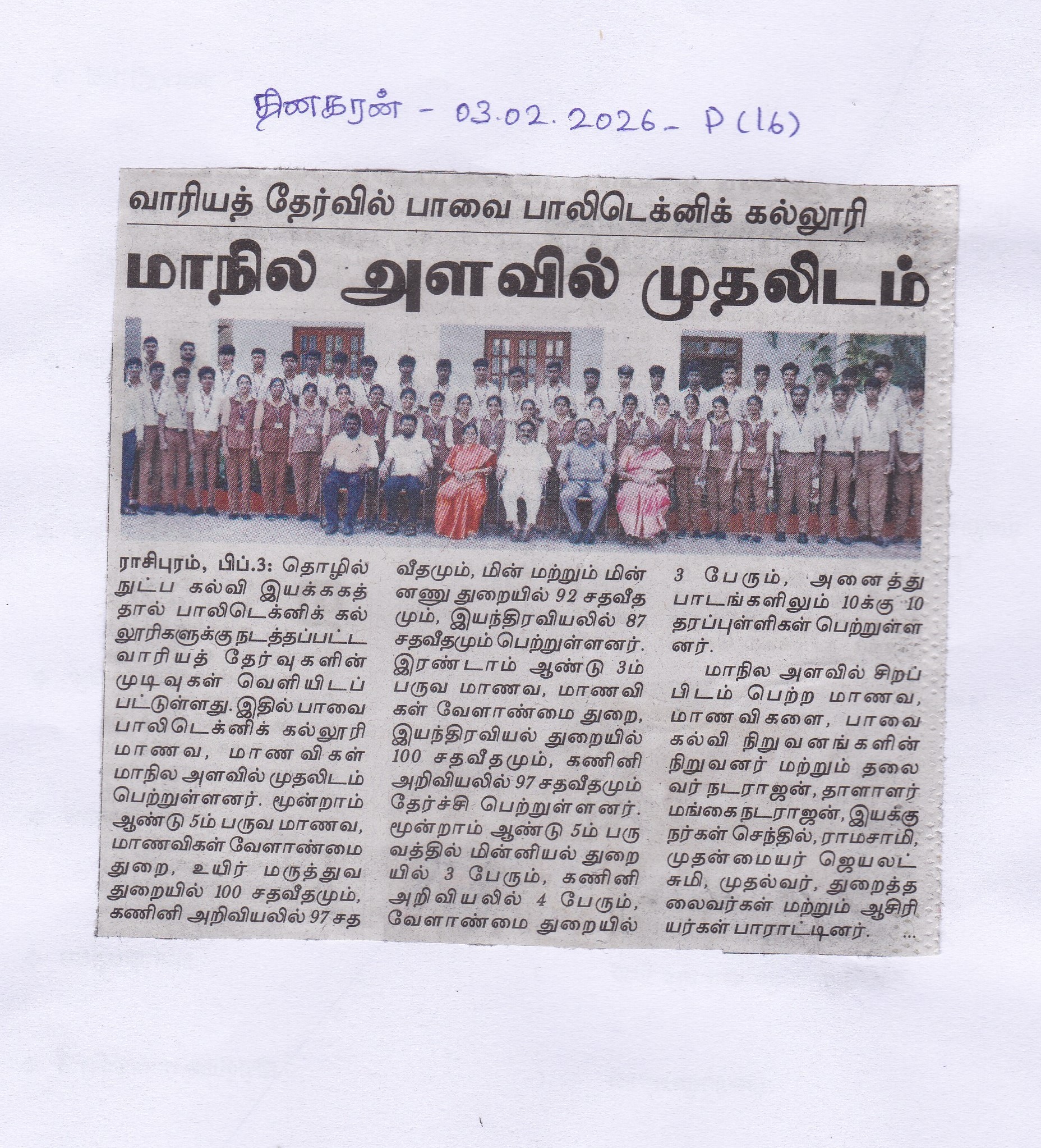 Paavai Polytechnic College Students Secure First Place with 0 Grade in State-Level Technical Education Examination (Oct 2025)